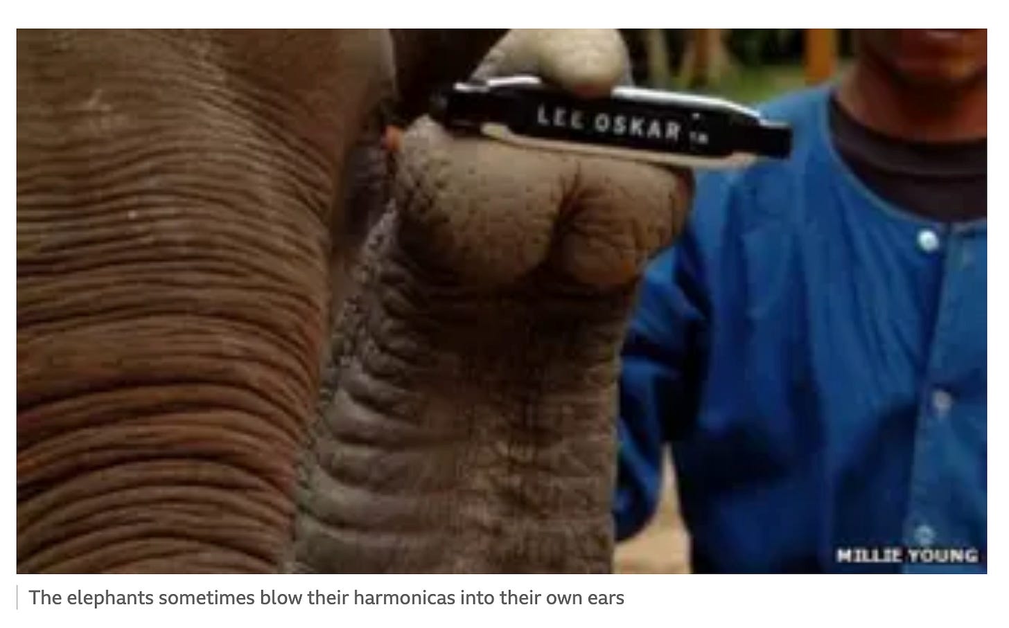 Wonderfully, the elephants can also play the harmonica. Not a special elephant harmonica, just a normal human harmonica2. Add that to the list of things elephants can do that I cannot.