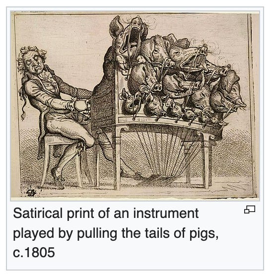 Also known as the “Swineway” or “Porko Forte,” this instrument (would have) worked by poking pigs or pulling their tails to produce pig noises in accordance with the notes of a scale.