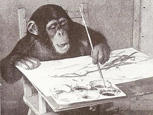 When the hoax was revealed, this critic was not embarrassed and instead insisted the monkey art was “still the best painting in the exhibition.” Imagine being a (human) artist in this exhibition. Imagine being somehow worse than a monkey at avant-garde art.