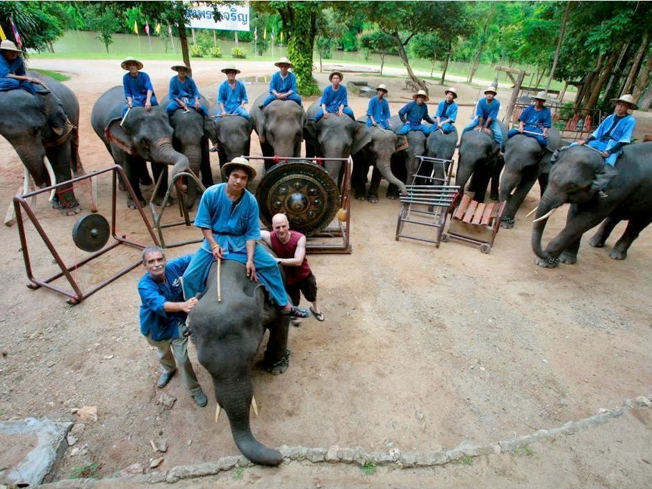 The Thai Elephant Orchestra, which “boasts it weighs three times as much as the Berlin Philharmonic,” is made up of a dozen or so elephants playing heavy-duty instruments specially designed for elephant-level strength.