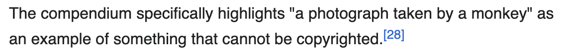 Because, as it turns out, an animal is not considered a “legal person” so far as copyright law is concerned, so the animal cannot own the art they create. But a human also cannot own the rights to something they did not personally create3. So when an animal creates art, who owns the copyright?