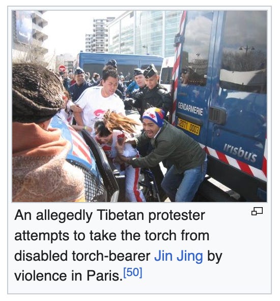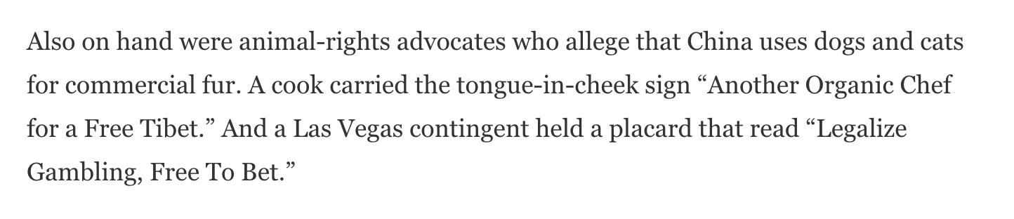 The torch route was visited at several different points by people protesting China’s human rights record. Also present were activists in favor of Tibetan independence, animal rights, nudism, and legal online gambling, and I’ve just gotta say – that’s gotta be the most iconic quartet of protest movements you could ever hope to assemble. Give me a naked vegan online casino hosted on servers located in a free Tibetan state. I am ready.