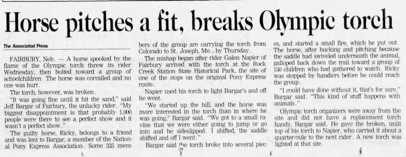 Another horse-torch connection occurred, but this time to more disastrous effect. A horse carrying the torch in Nebraska got spooked by the flame, threw its rider off, and then “bolted toward a group of [150] schoolchildren.” (the kids were unhurt)