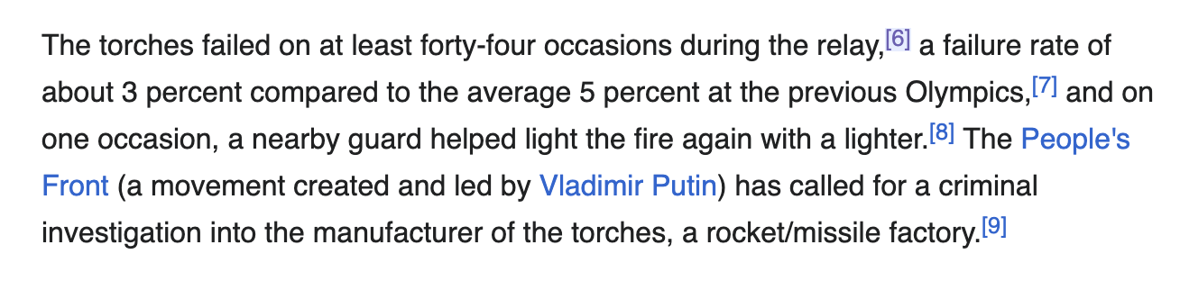 Anyway, all the crazy stuff that happened during this torch relay caused the IOC to require future torch relays to take place solely within the host country2, which makes a lot of sense.