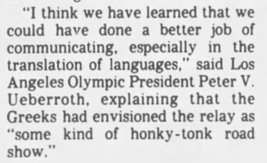 The AT&T Olympic Torch Relay, as it was known, was the first torch relay whose funding came primarily from corporate sponsorships. The general manager of the LA organizing committee said, “we have not commercialized the torch run,” despite that being exactly what they did. Oh well.