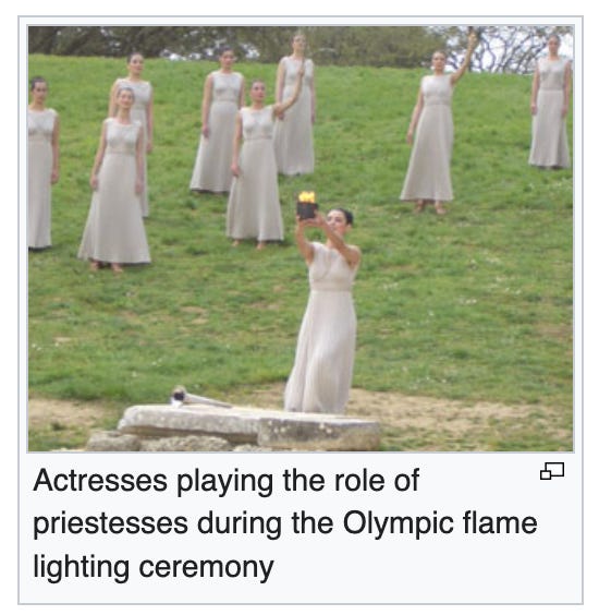 Months before the Games kick off, the Greeks hold a ceremony at the Temple of Hera, featuring a group of women dressed as Vestal Virgins saying some stuff in Greek and then lighting the first torch. Here’s a clip of the ceremony for Tokyo 2020.